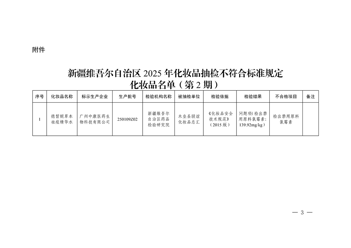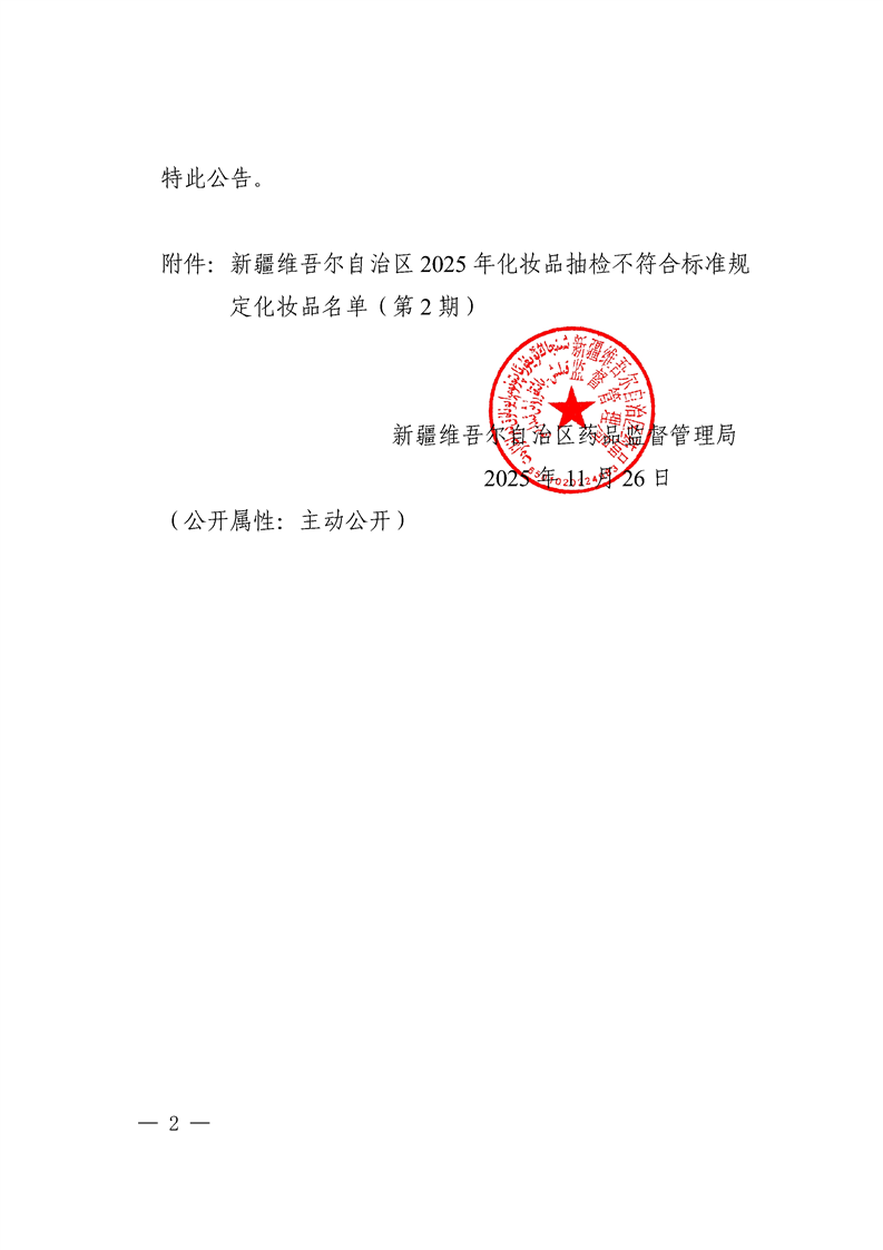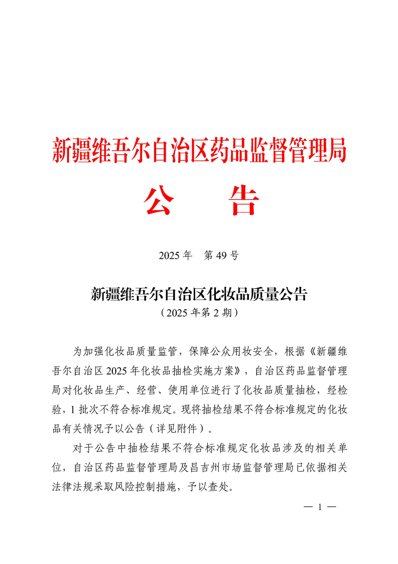 新疆维吾尔自治区化妆品质量公告(2025年第2期)