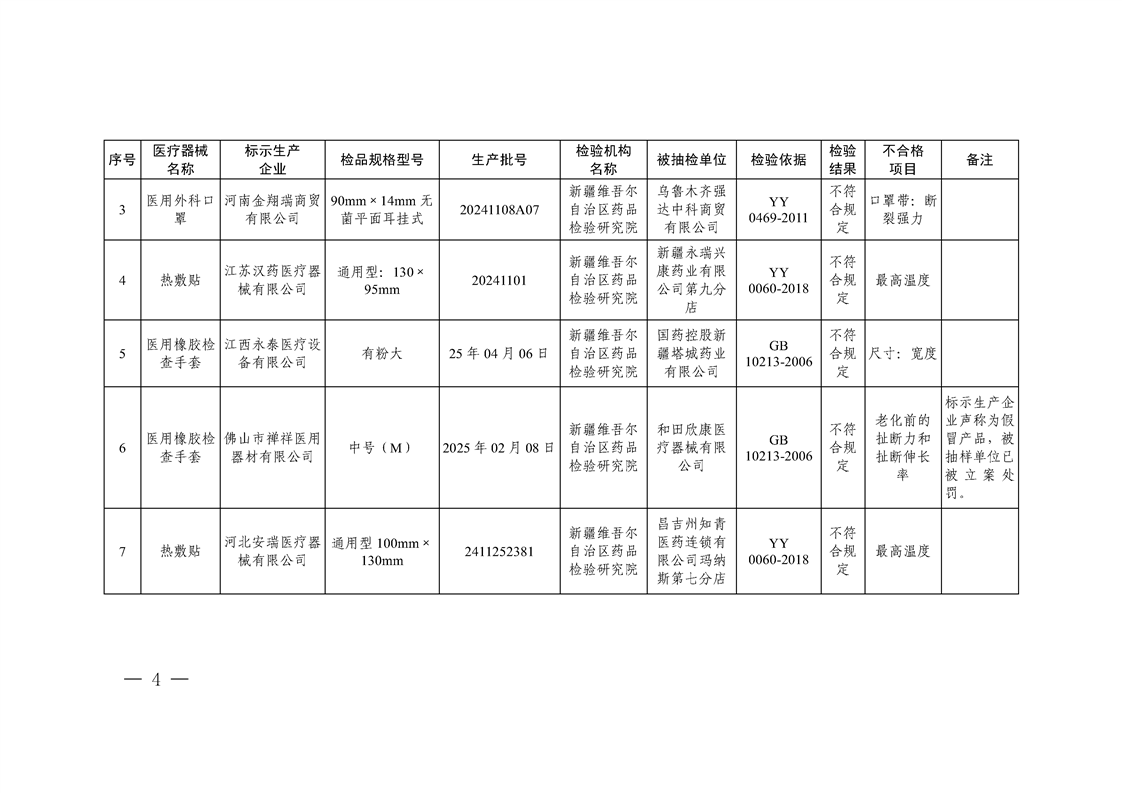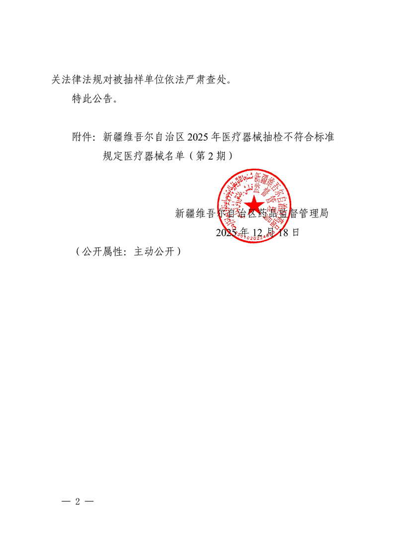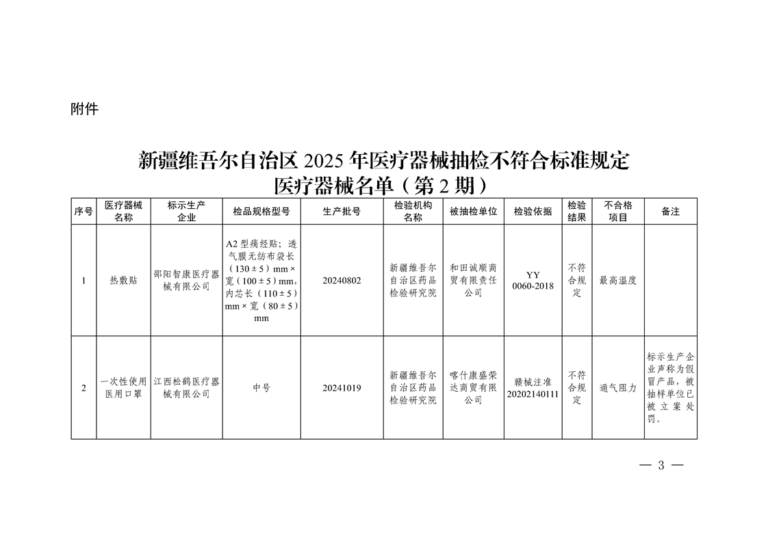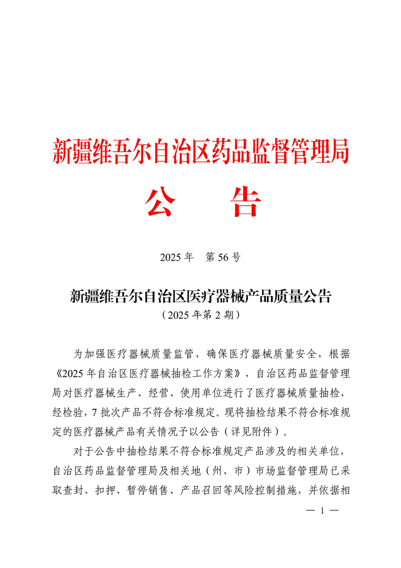 新疆维吾尔自治区医疗器械产品质量公告(2025年第2期)