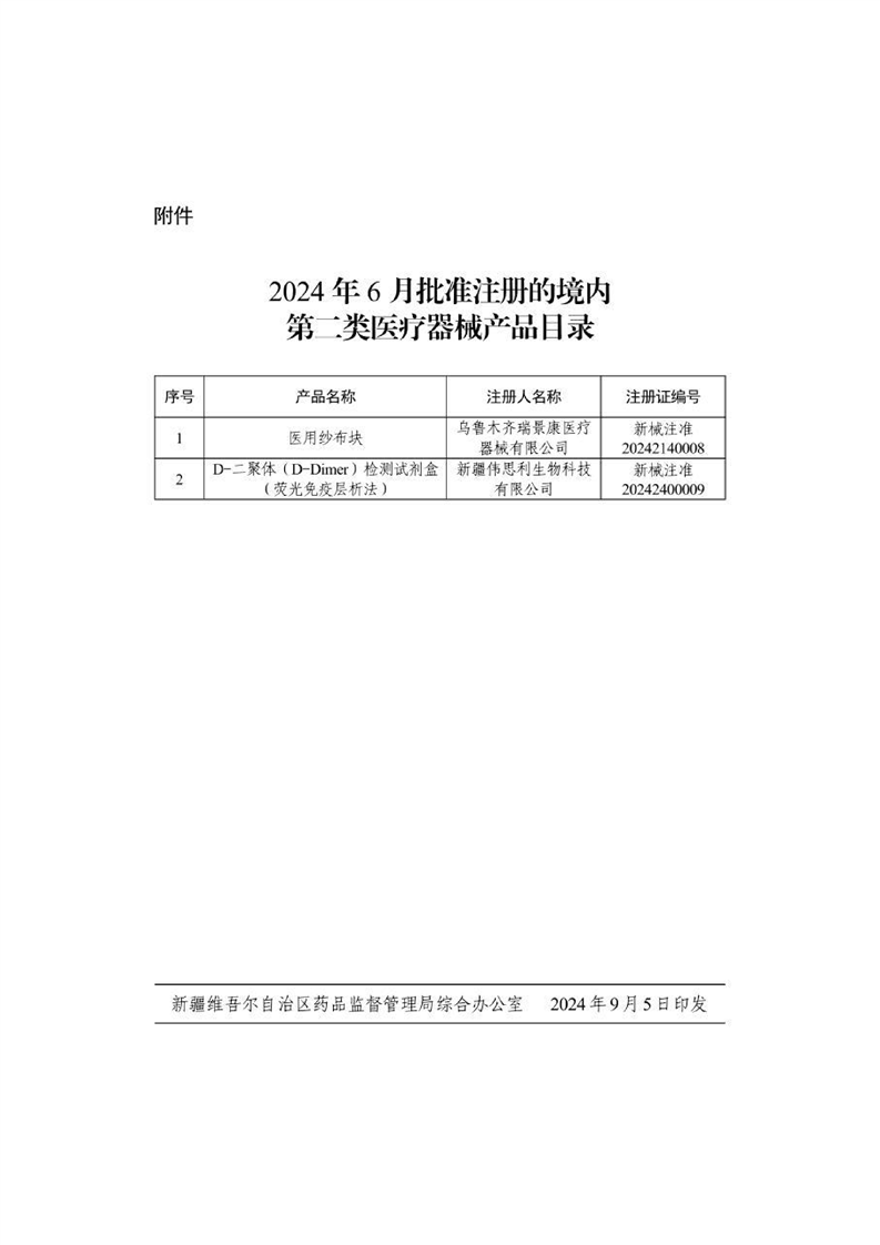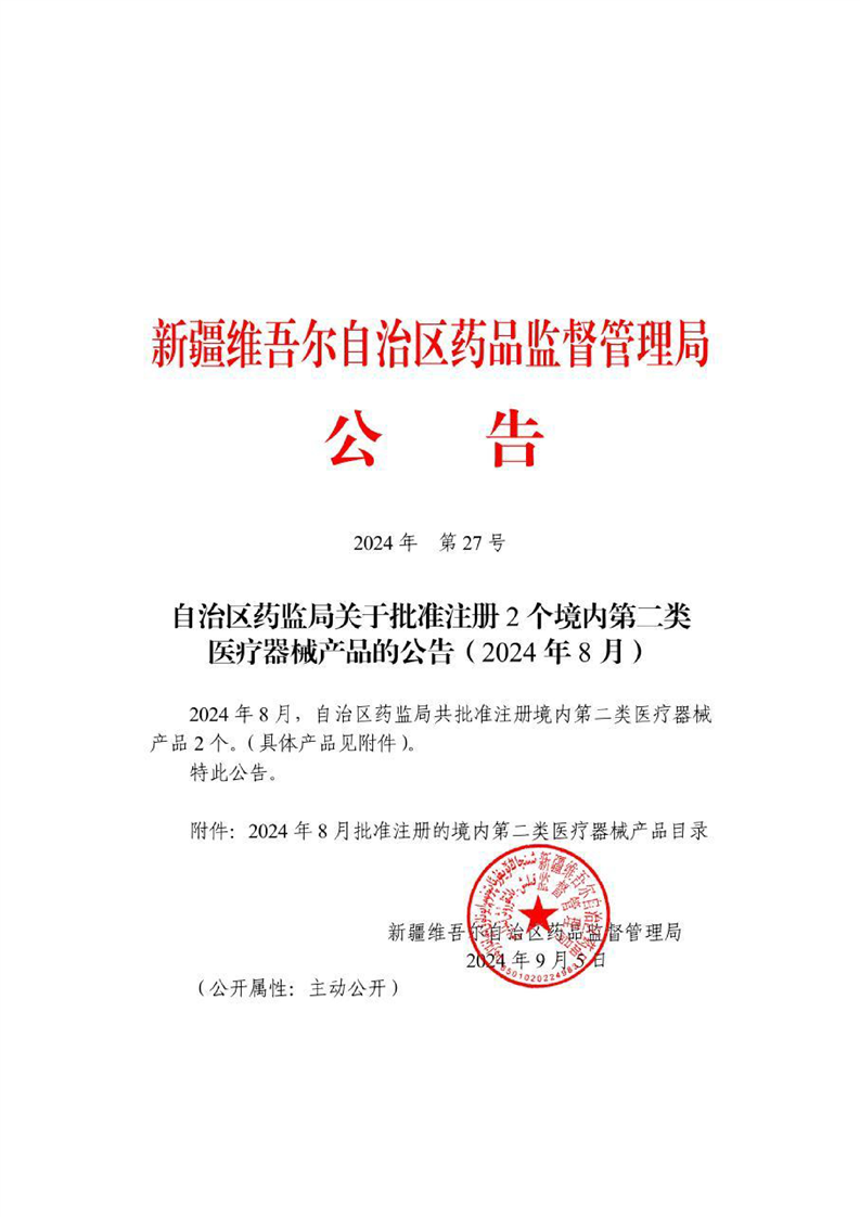 自治区药监局关于批准注册2个境内第二类医疗器械产品的公告(2024年8月)