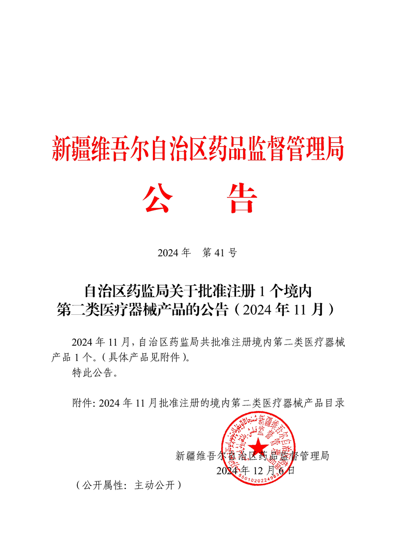 自治区药监局关于批准注册1个境内第二类医疗器械产品的公告(2024年11月)