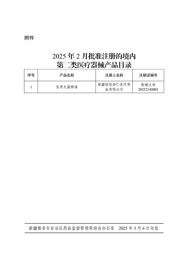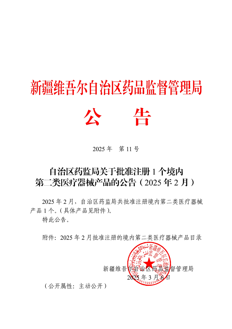 自治区药监局关于批准注册1个境内第二类医疗器械产品的公告(2025年2月)