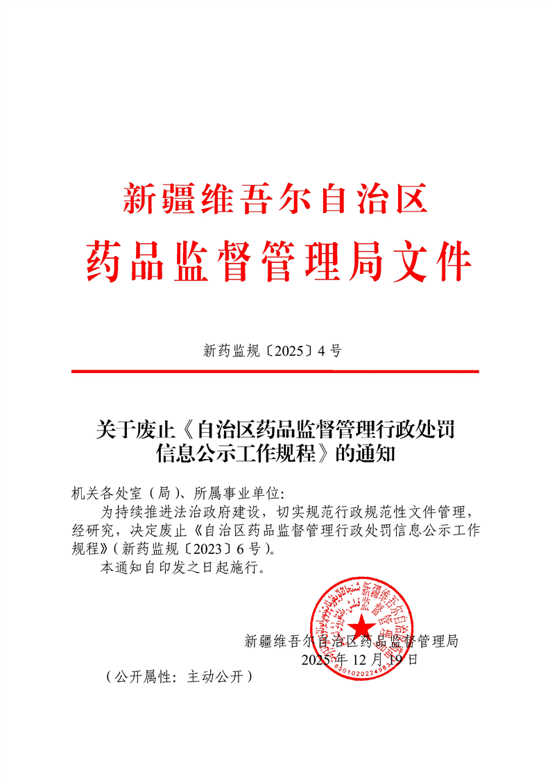 关于废止《自治区药品监督管理行政处罚信息公示工作规程》的通知
