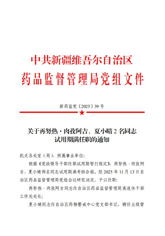 关于再努热·肉孜阿吉、夏小晴2名同志试用期满任职的通知