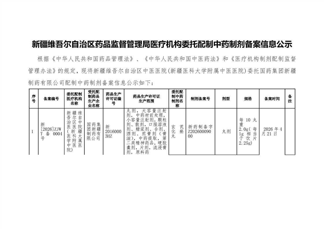 新疆维吾尔自治区药品监督管理局医疗机构委托配制中药制剂备案信息公示
