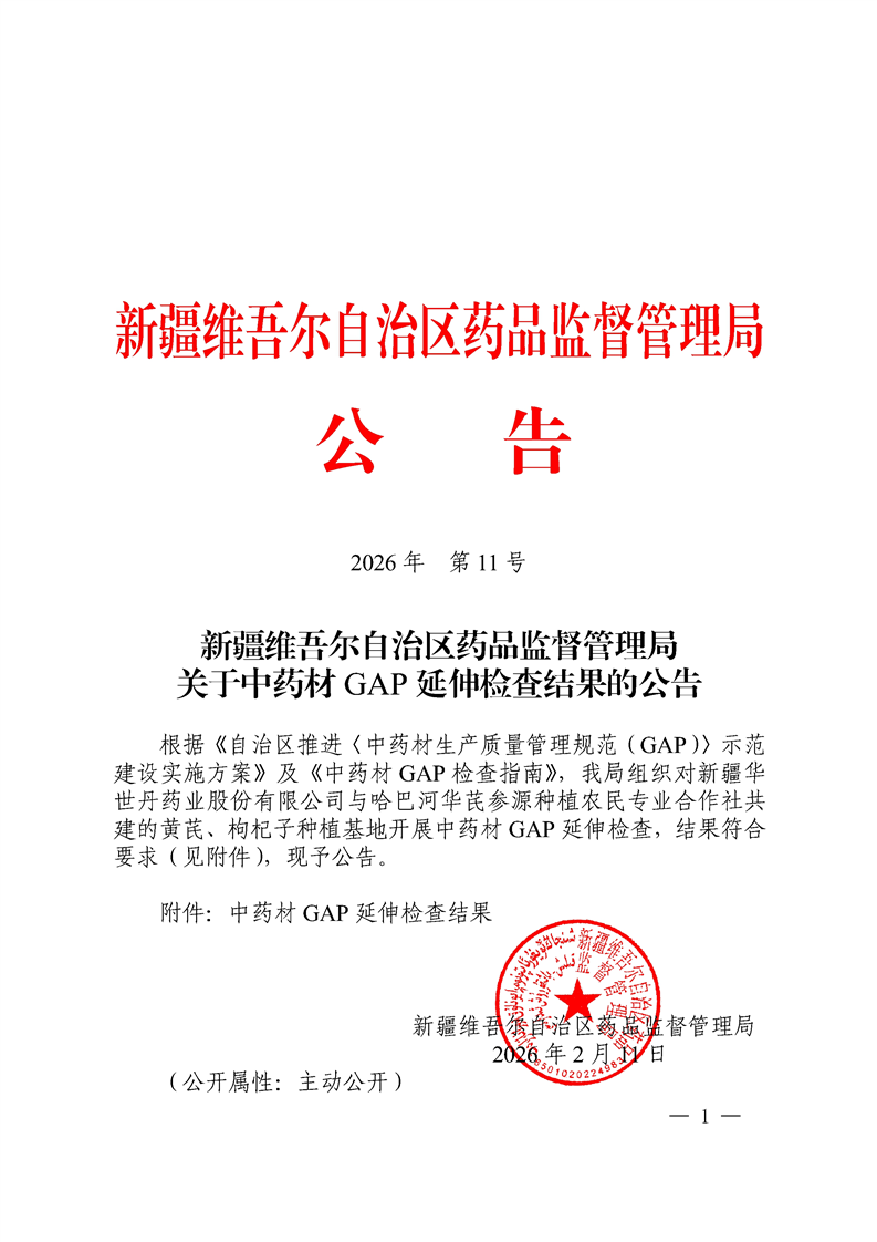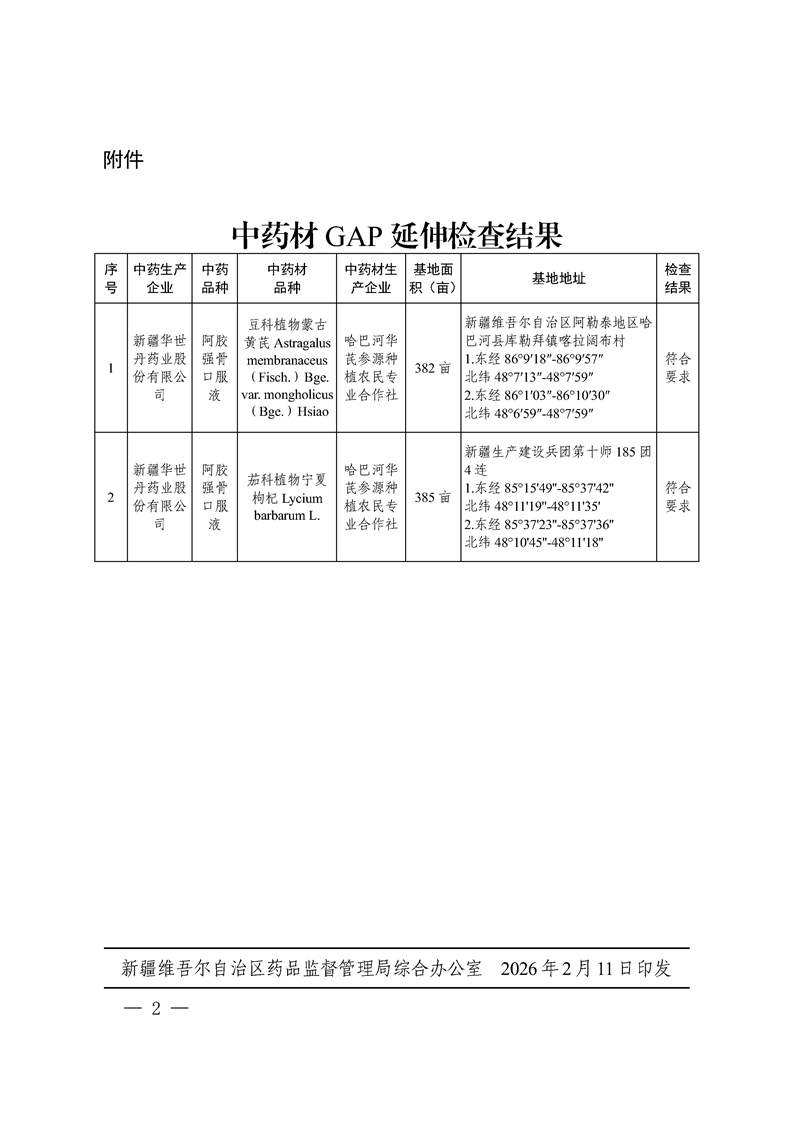 新疆维吾尔自治区药品监督管理局关于中药材GAP延伸检查结果的公告(2026年第11号)