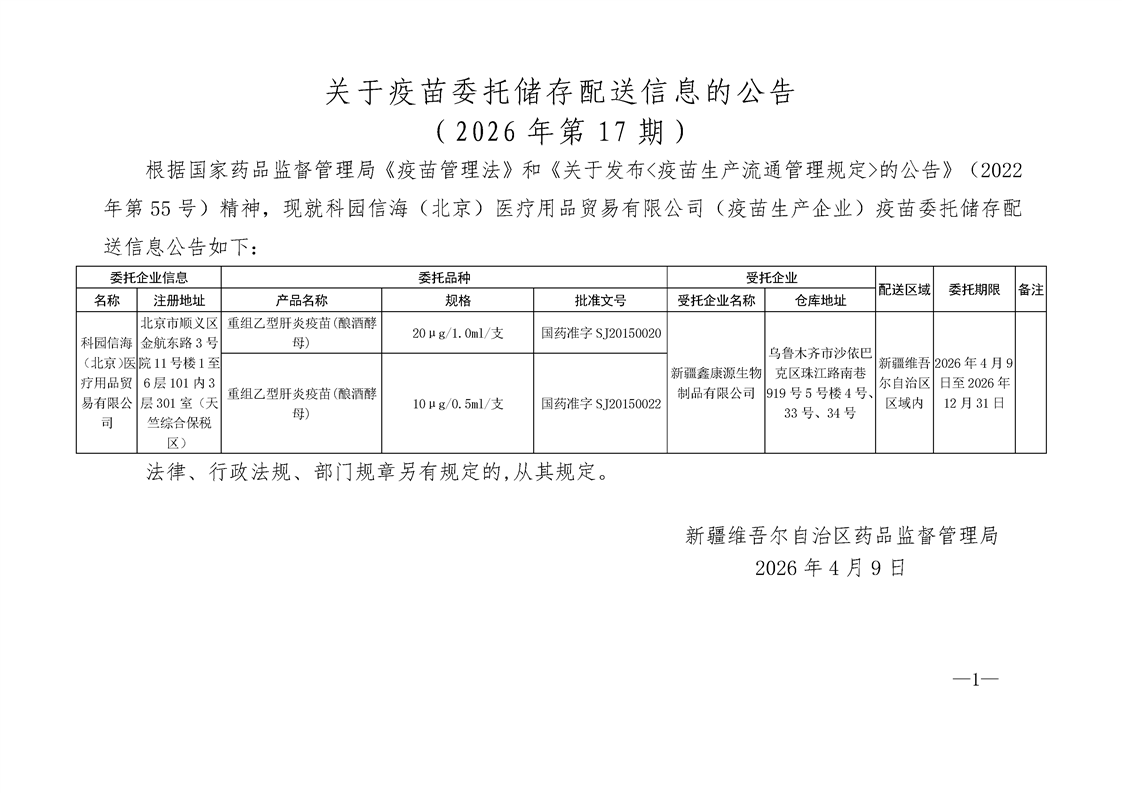 关于疫苗委托储存配送信息的公告(2026年第17期)