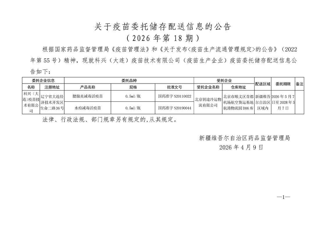 关于疫苗委托储存配送信息的公告(2026年第18期)