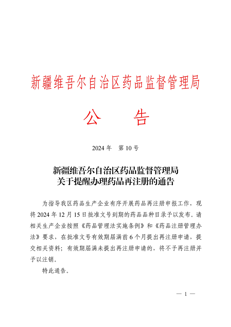 新疆维吾尔自治区药品监督管理局关于提醒办理药品再注册的通告(公告2024年第10号)