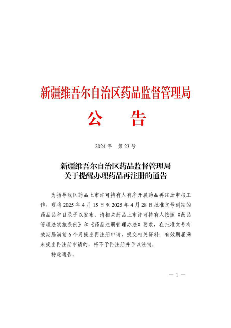 新疆维吾尔自治区药品监督管理局关于提醒办理药品再注册的通告(2024年第23号)