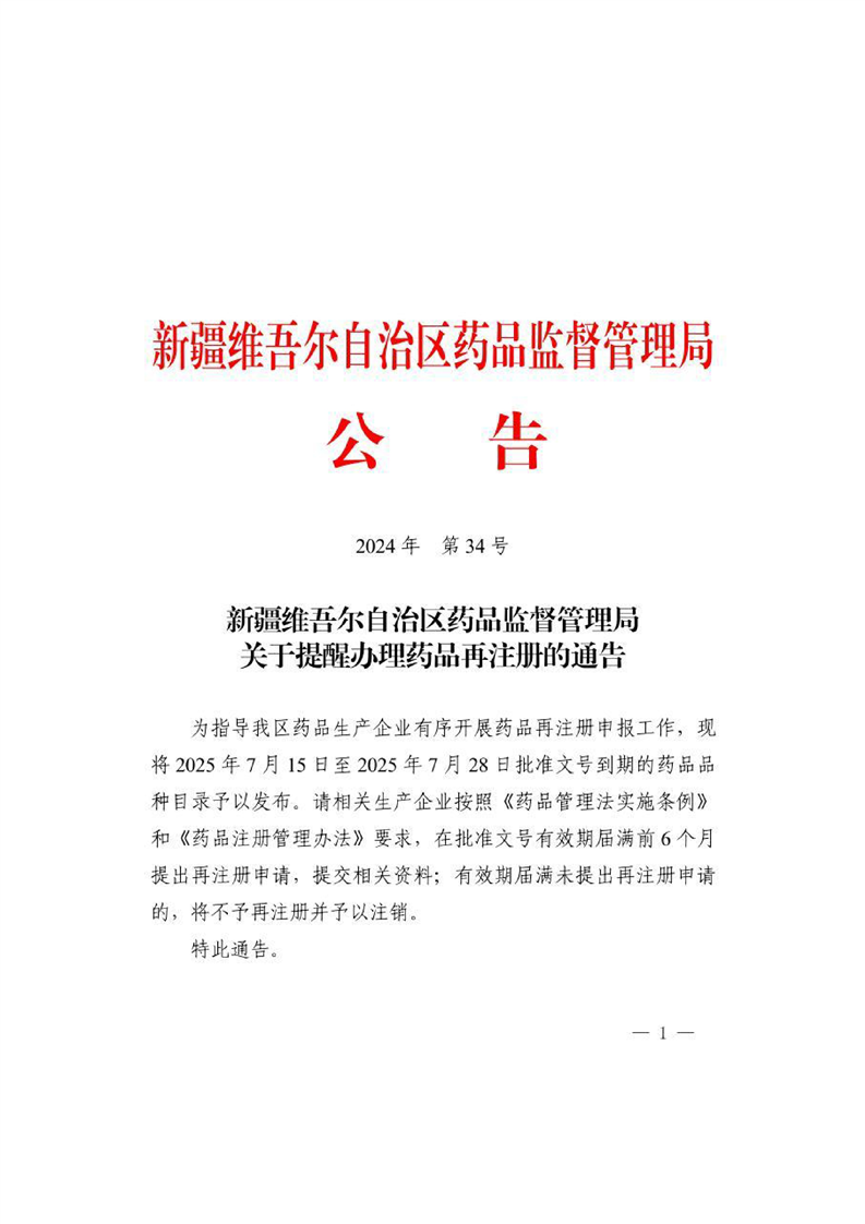 新疆维吾尔自治区药品监督管理局关于提醒办理药品再注册的通告(2024年第34号)