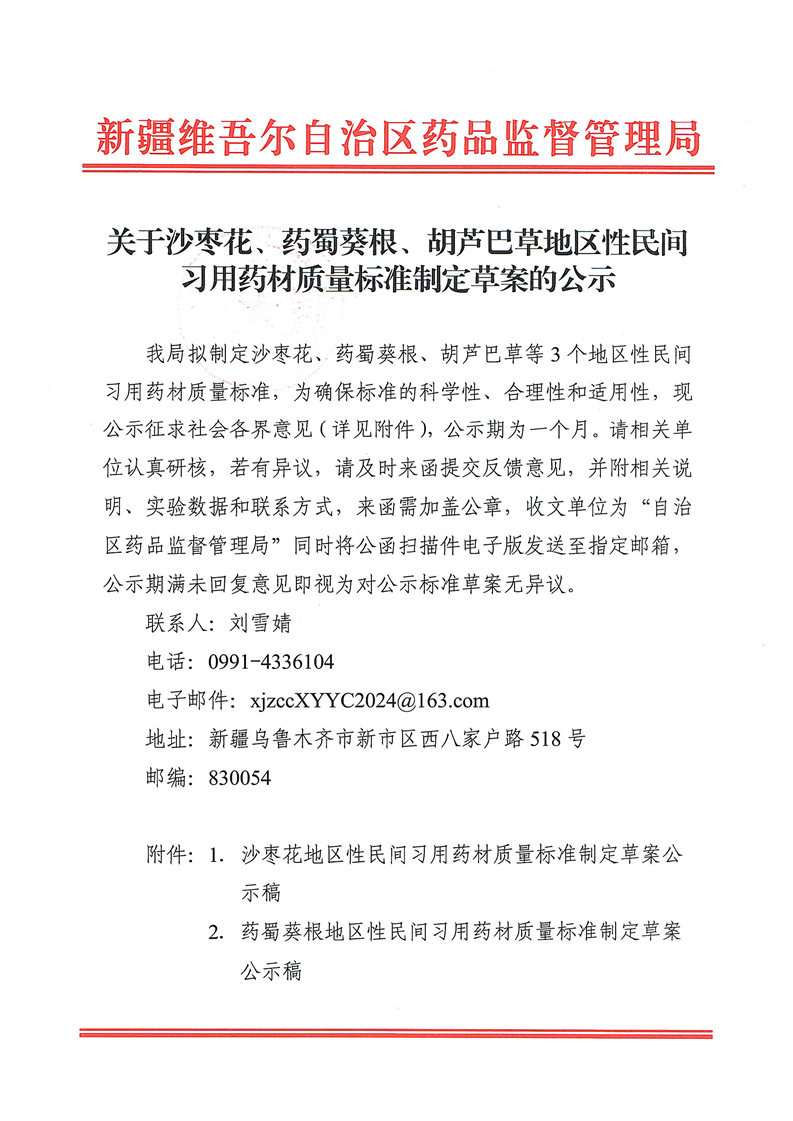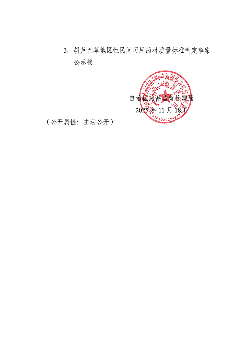 新疆维吾尔自治区药品监督管理局关于沙枣花、药蜀葵根、胡芦巴草地区性民间习用药材质量标准制定草案的公示