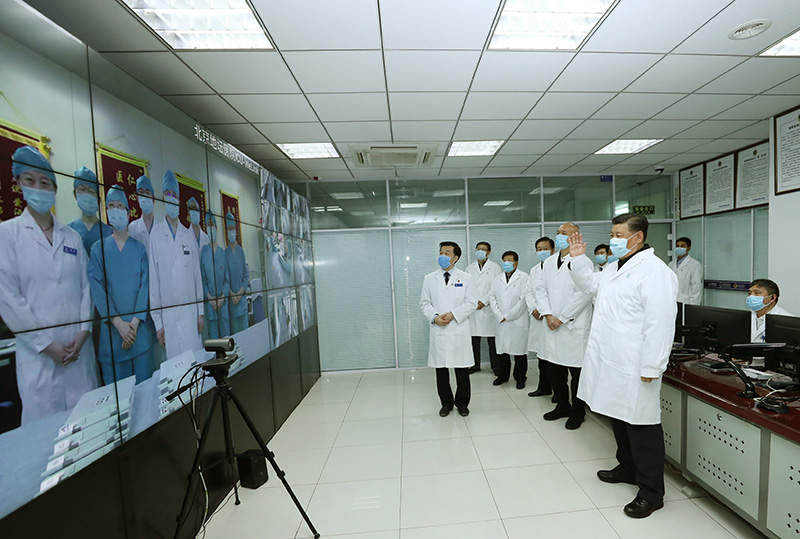 习近平十分牵挂湖北和武汉的疫情。在地坛医院远程诊疗中心,习近平通过视频连线武汉市收治新冠肺炎患者的金银潭医院、协和医院、火神山医院,向疫情防控一线的医务工作者、干部职工和人民解放军指战员了解情况、听取意见和建议。他强调,全国广大医务工作者不忘初心、牢记使命,响应党的号召,义无反顾冲上疫情防控第一线,同时间赛跑,与病魔较量,顽强拼搏、日夜奋战,展现了对党、对人民高度负责的精神面貌。他指出,现在疫情防控正处于胶着对垒状态,广大医务工作者一定要坚持下去,发扬特别能吃苦、特别能战斗的精神,发挥火线上的中流砥柱作用,始终把人民群众生命安全和身体健康放在首位,全力以赴救治患者,打好武汉保卫战、湖北保卫战。