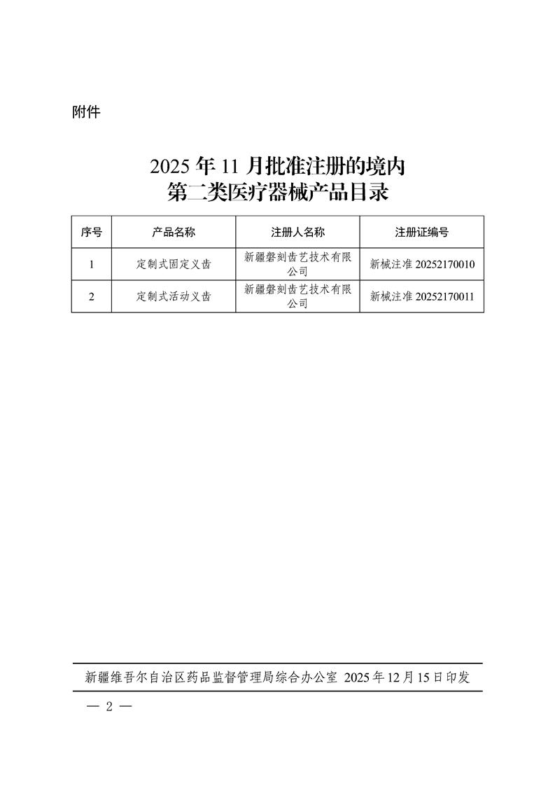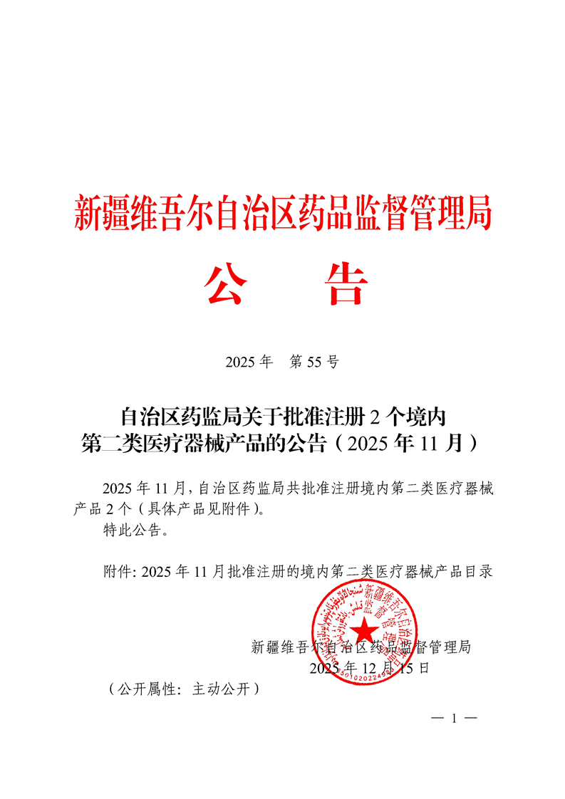 自治区药监局关于批准注册2个境内第二类医疗器械产品的公告(2025年11月)