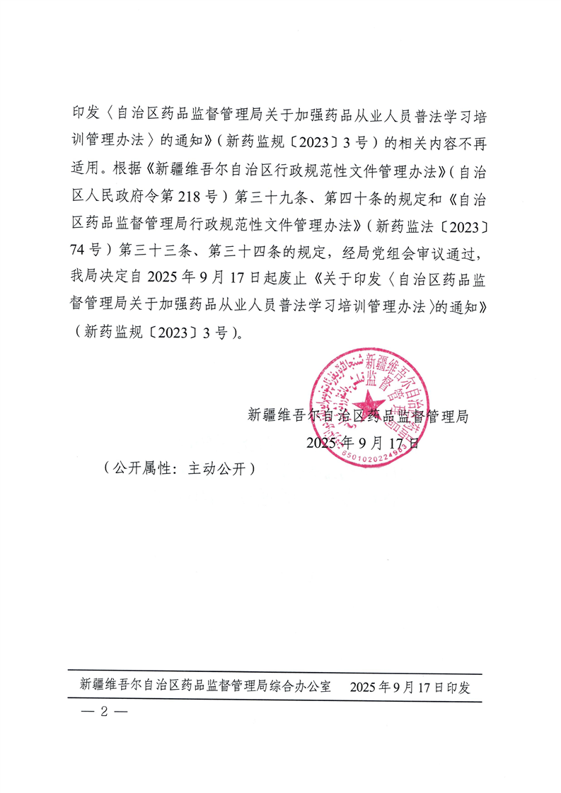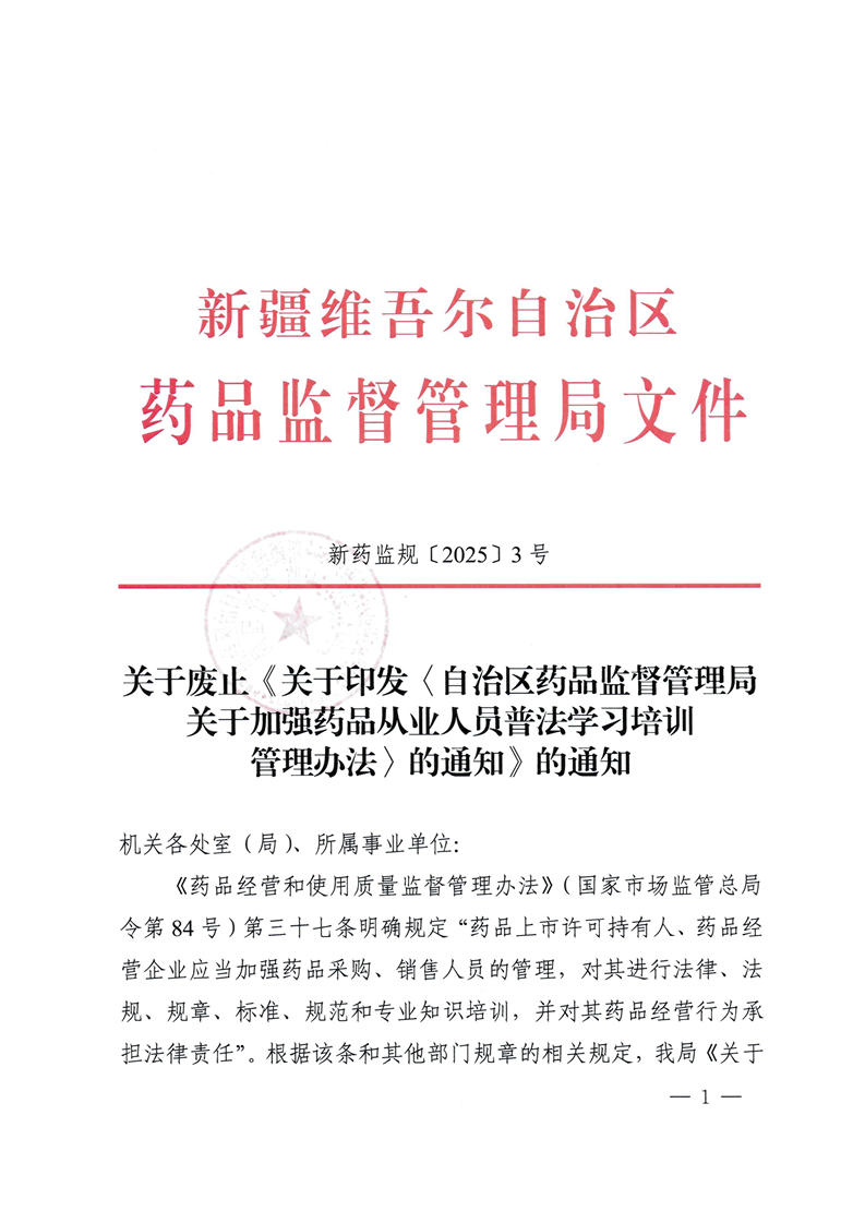 关于废止《关于印发(自治区药品监督管理局关于加强药品从业人员普法学习培训管理办法)的通知》