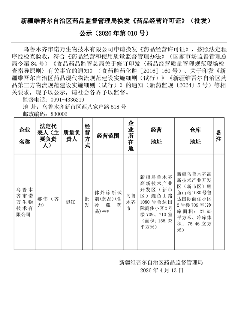 新疆维吾尔自治区药品监督管理局换发《药品经营许可证》(批发)公示(2026年第010号)
