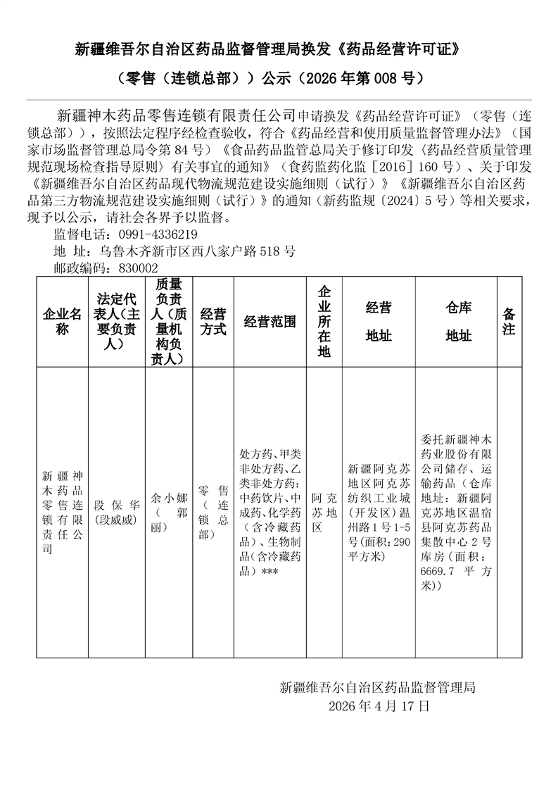 新疆维吾尔自治区药品监督管理局换发《药品经营许可证》(零售(连锁总部))公示(2026年第008号)
