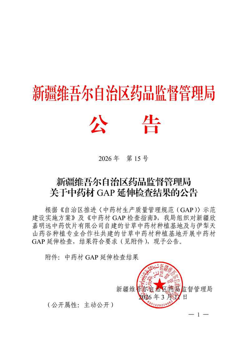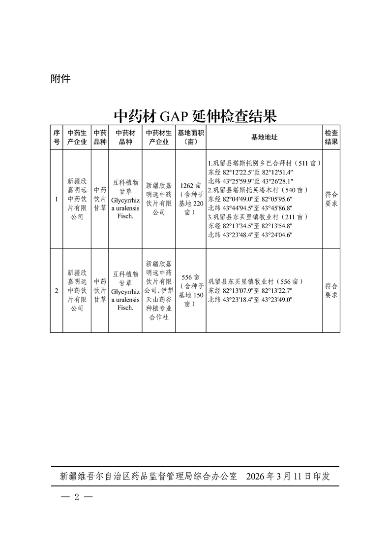 新疆维吾尔自治区药品监督管理局关于中药材GAP延伸检查结果的公告 (2026年第15号)