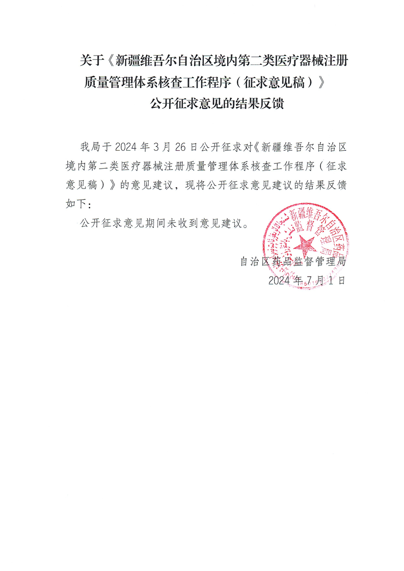 关于《新疆维吾尔自治区境内第二类医疗器械注册质量管理体系核查工作程序(征求意见稿)》公开征求意见的结果反馈