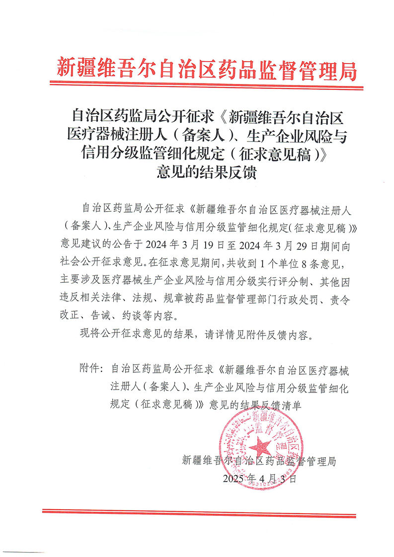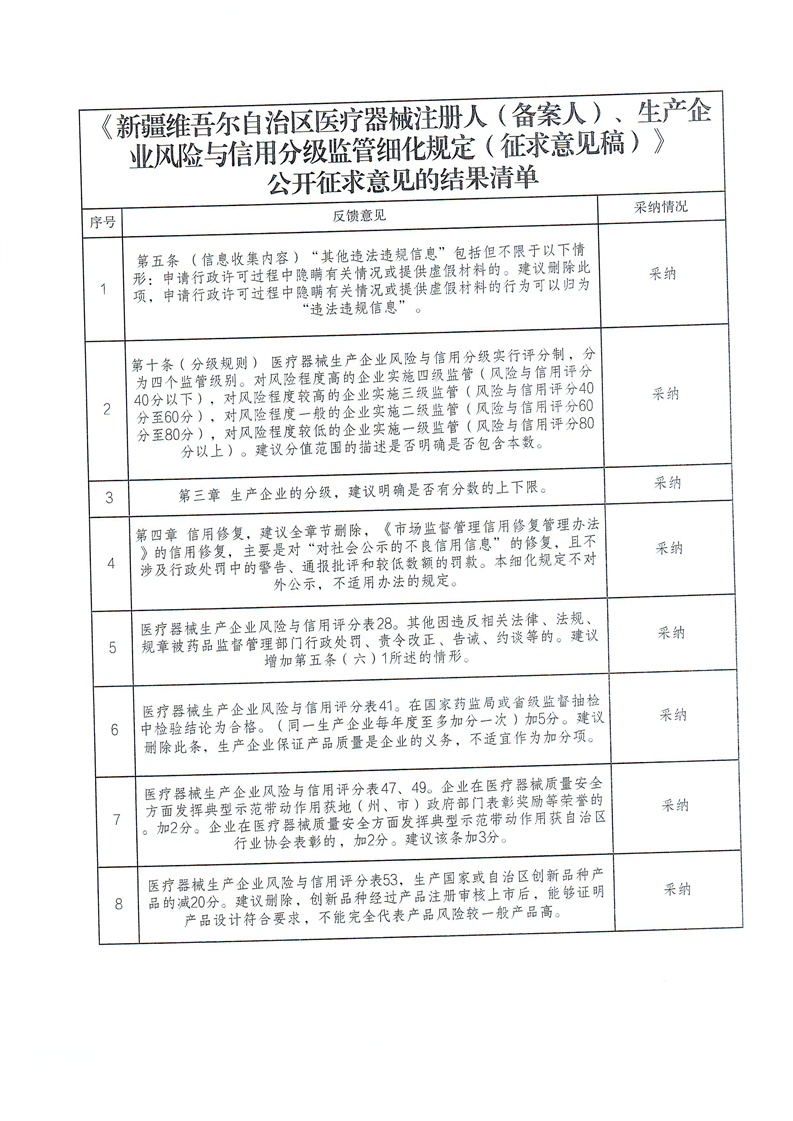 自治区药监局公开征求《新疆维吾尔自治区医疗器械注册人(备案人)、生产企业风险与信用分级监管细化规定(征求意见稿)》意见的结果反馈