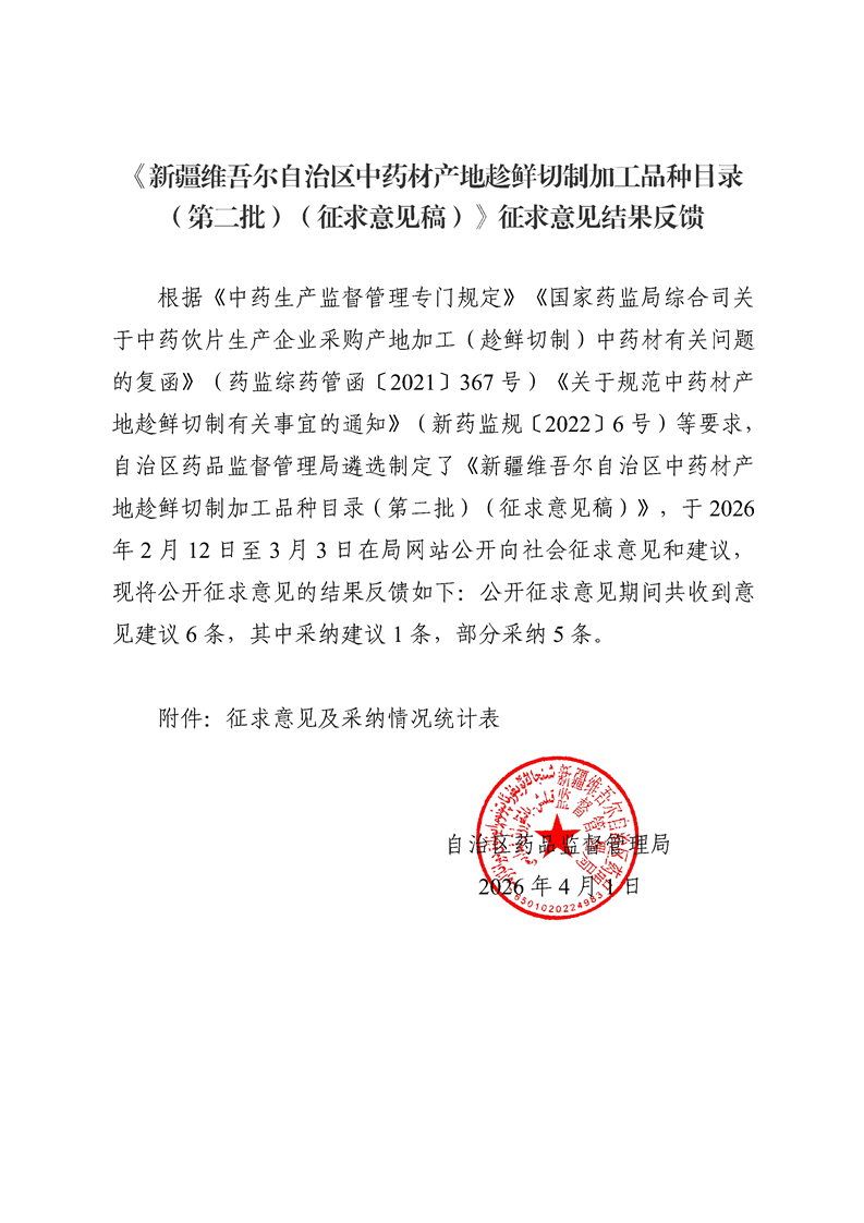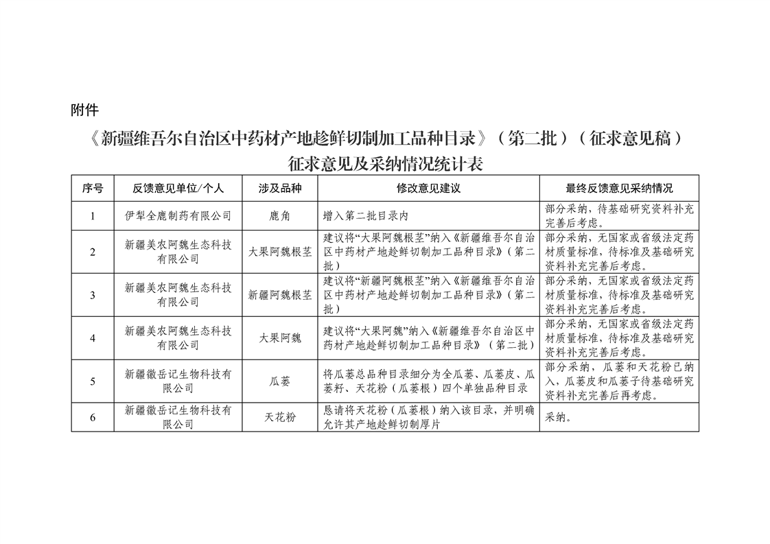 《新疆维吾尔自治区中药材产地趁鲜切制加工品种目录(第二批)(征求意见稿)》征求意见结果反馈