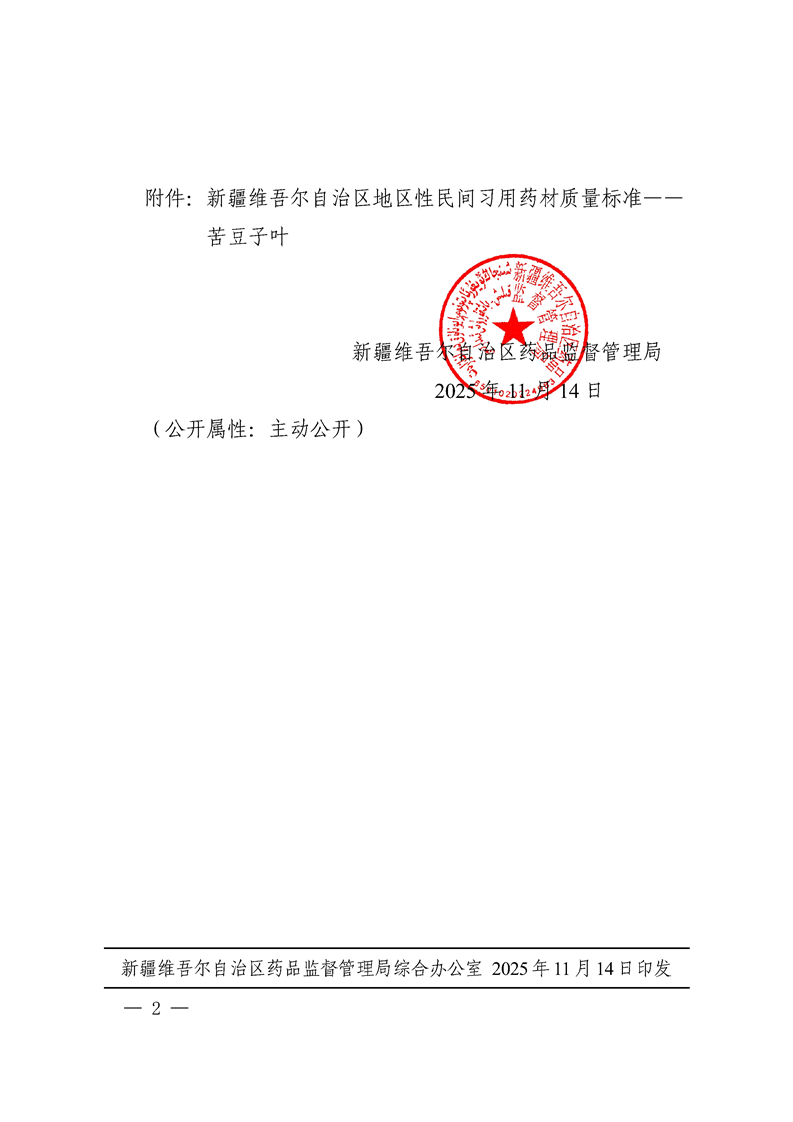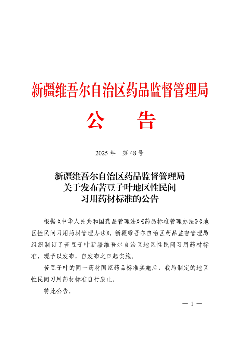 新疆维吾尔自治区药品监督管理局关于发布苦豆子叶地区性民间习用药材标准的公告